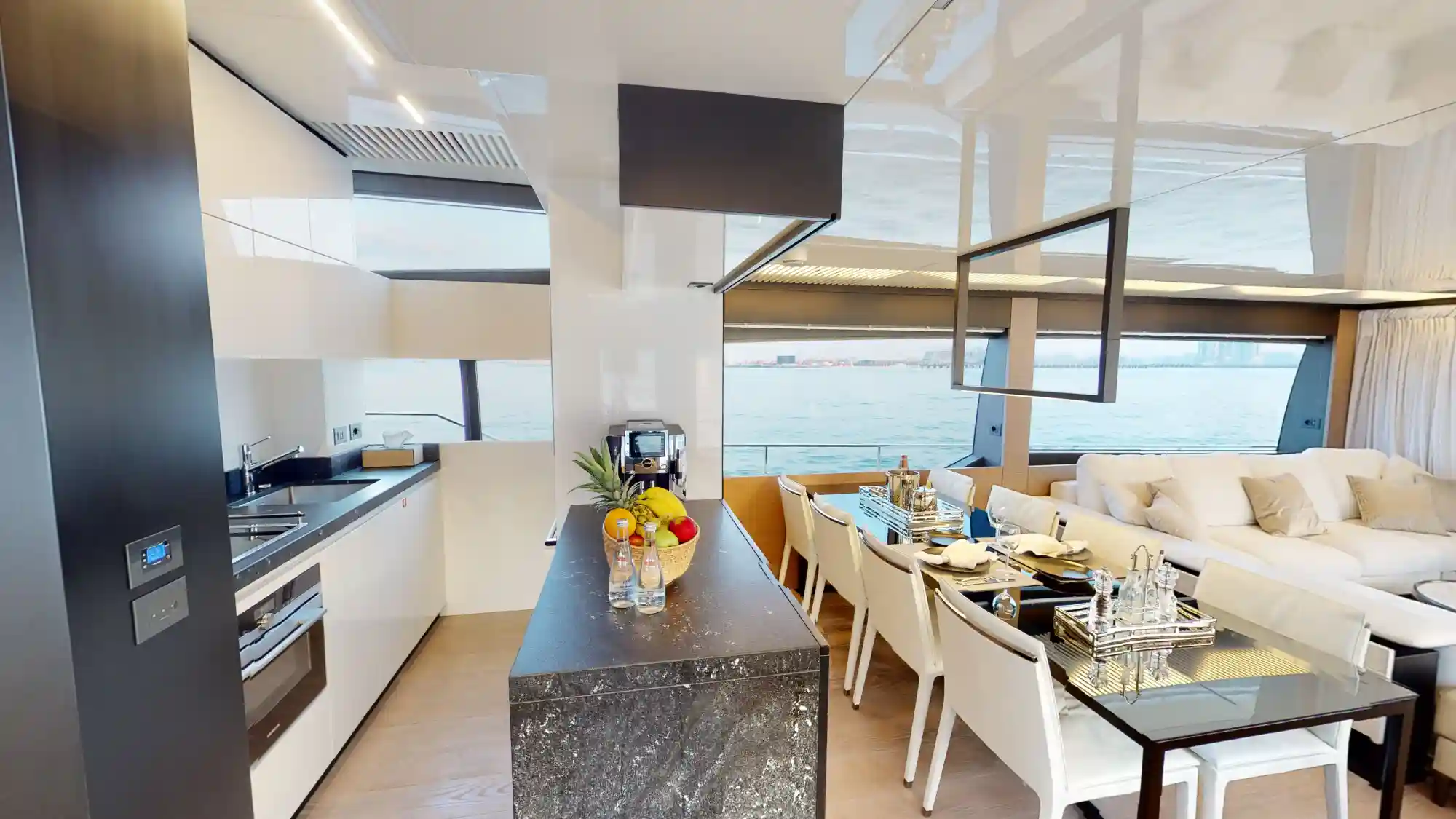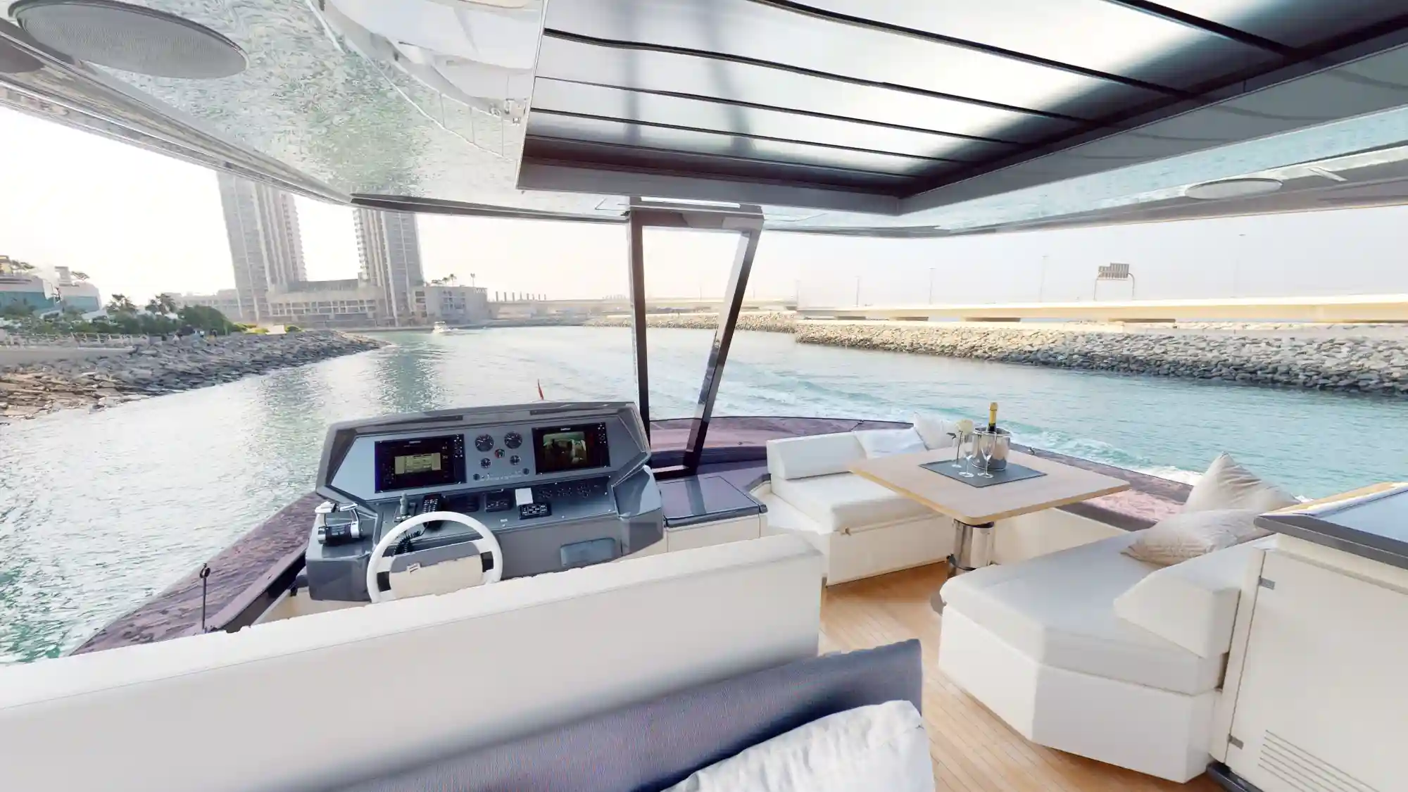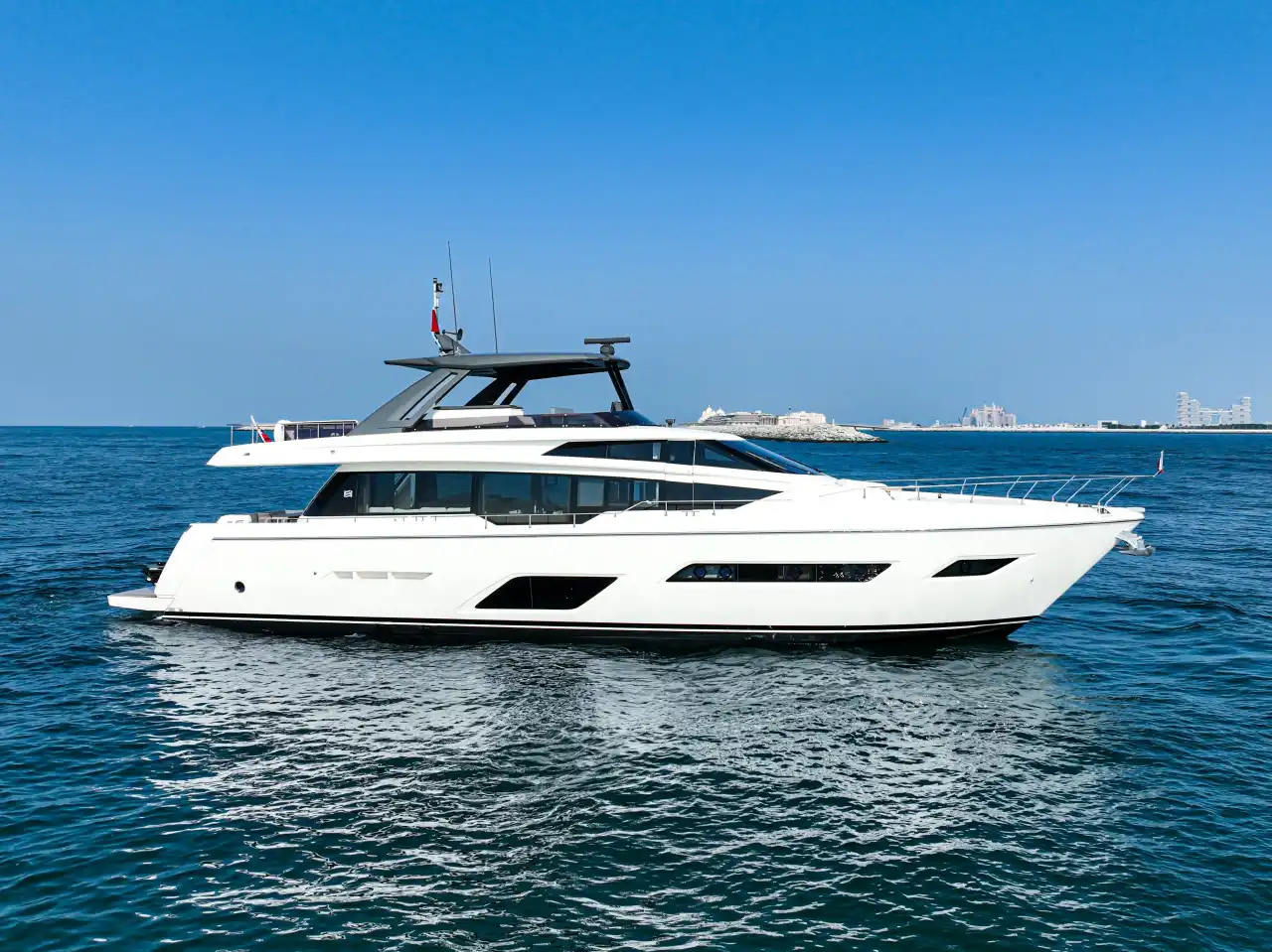 The premium Ferretti 78ft yacht, built in 2019, is available for rent in Dubai, UAE. It features 4 rooms, can accommodate up to 20 guests, and is operated by 3 professional and experienced crew members. Barbecue service is permitted onboard, with equipment available upon prior request. The Ferretti 78 is offered for rental at 5,000 AED per hour in Dubai.